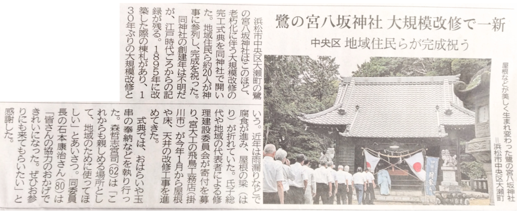 浜松市中央区大瀬町 鷺の宮八坂神社の大規模改修工事が完了し、2025年8月11日完工式典が開かれました。