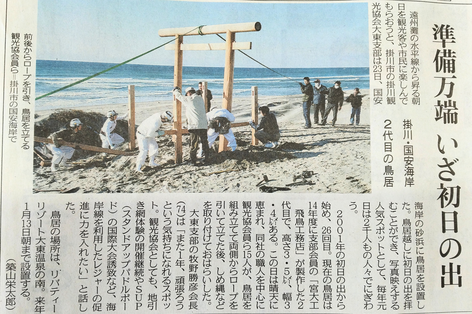 宮大工を含む15名で砂丘に柱を組み上げ、縄をかけて立ち上げ、しめ縄を飾って約2時間で完成させた鳥居は、海と空に映える冬の象徴です。