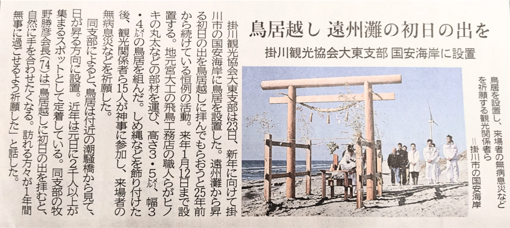 遠州灘から昇る初日の出を迎える鳥居 海岸に設置2025