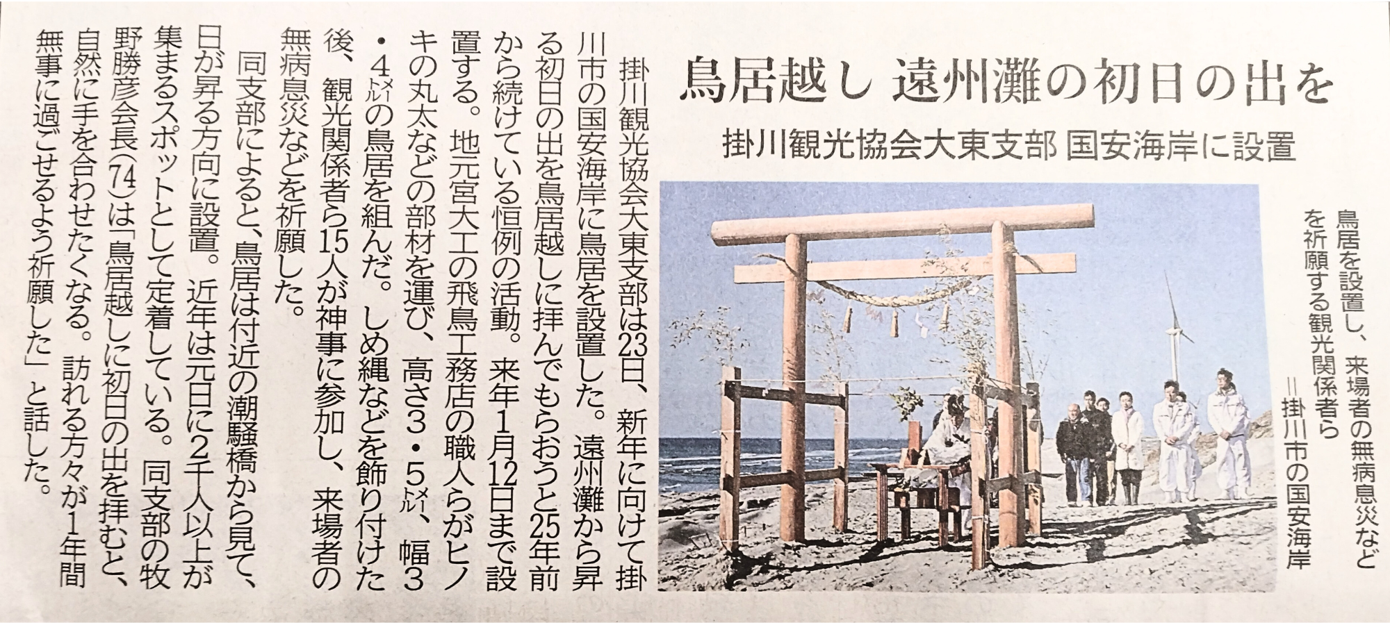 私たちは、その新年の門出をより厳かに迎えていただくため、観光協会の皆さんとともに、杉とヒノキを使った高さ3.5メートルの鳥居を建立しました。