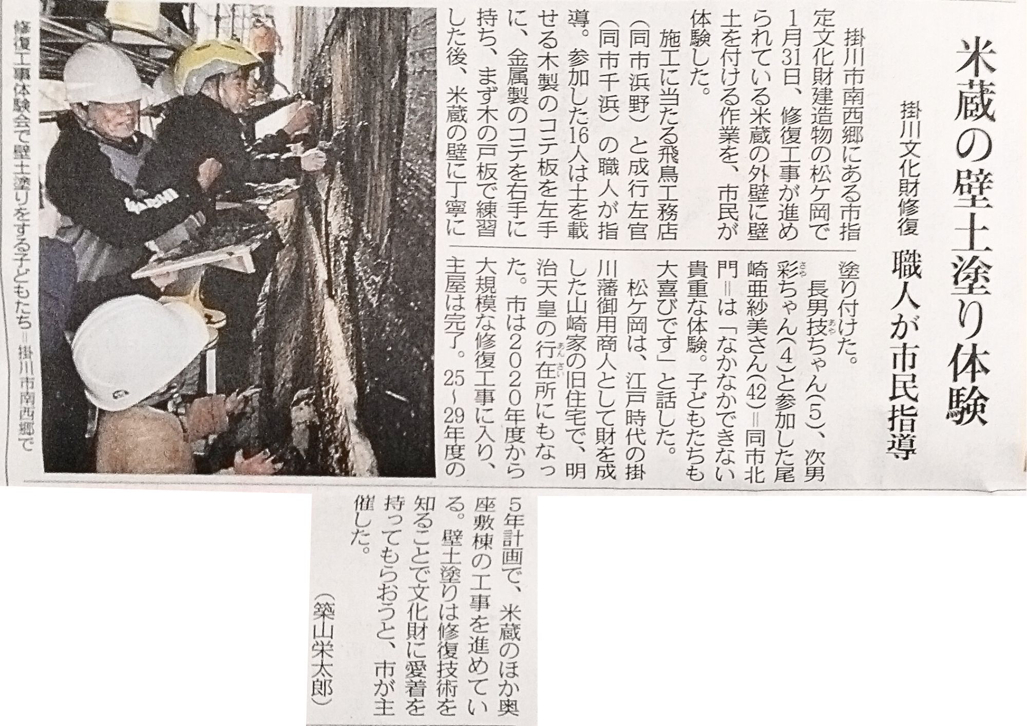 掛川市指定文化財「松ケ岡」で進めている米蔵の修復工事。その現場で1月31日、市民の皆さまに壁土塗りを体験していただきました。