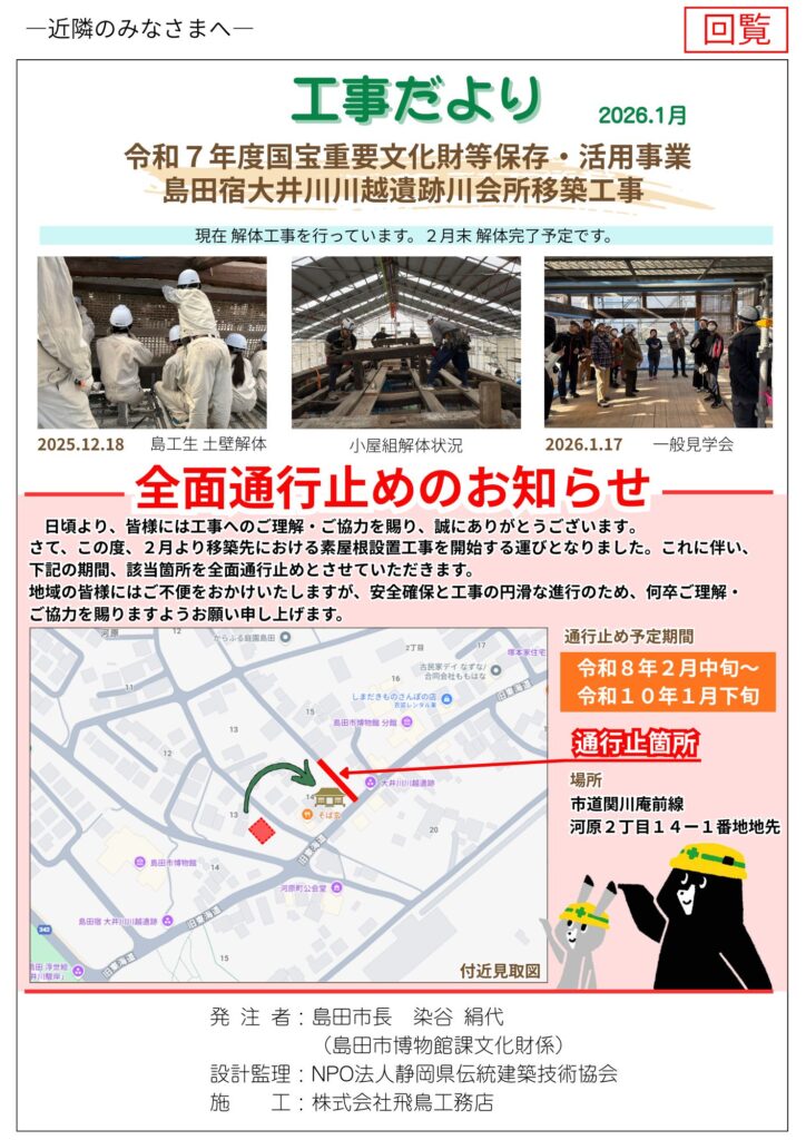 島田宿大井川川越遺跡「川会所」移築工事に伴う通行止めのお知らせ